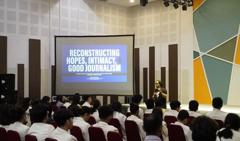 Mahasiswa semester 4 program studi Ilmu Komunikasi tersebut memperoleh materi “Reconstructing Hopes, Intimacy, & Good Journalism” yang langsung disampaikan oleh Eddy Prastyo, Manajer Produksi Suara Surabaya Media.