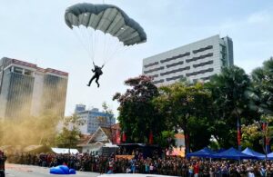 Aksi Terjun Payung 6.000 Kaki Meriahkan Hari Marinir Ke-80 di Grahadi