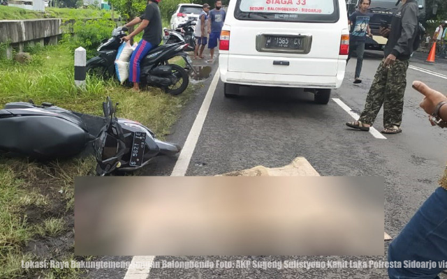 Pengendara sepeda motor meninggal dunia di lokasi setelah terlibat kecelakaan dengan Truck tronton di Raya Bakungtemenggungan Balongbendo