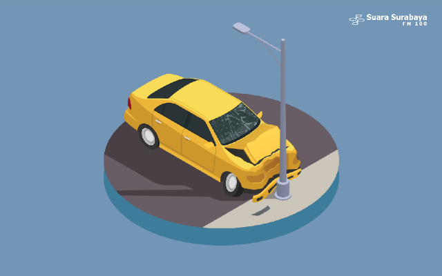 Mobil naik ke pembatas jalan di depan Mc Donald Graha Family