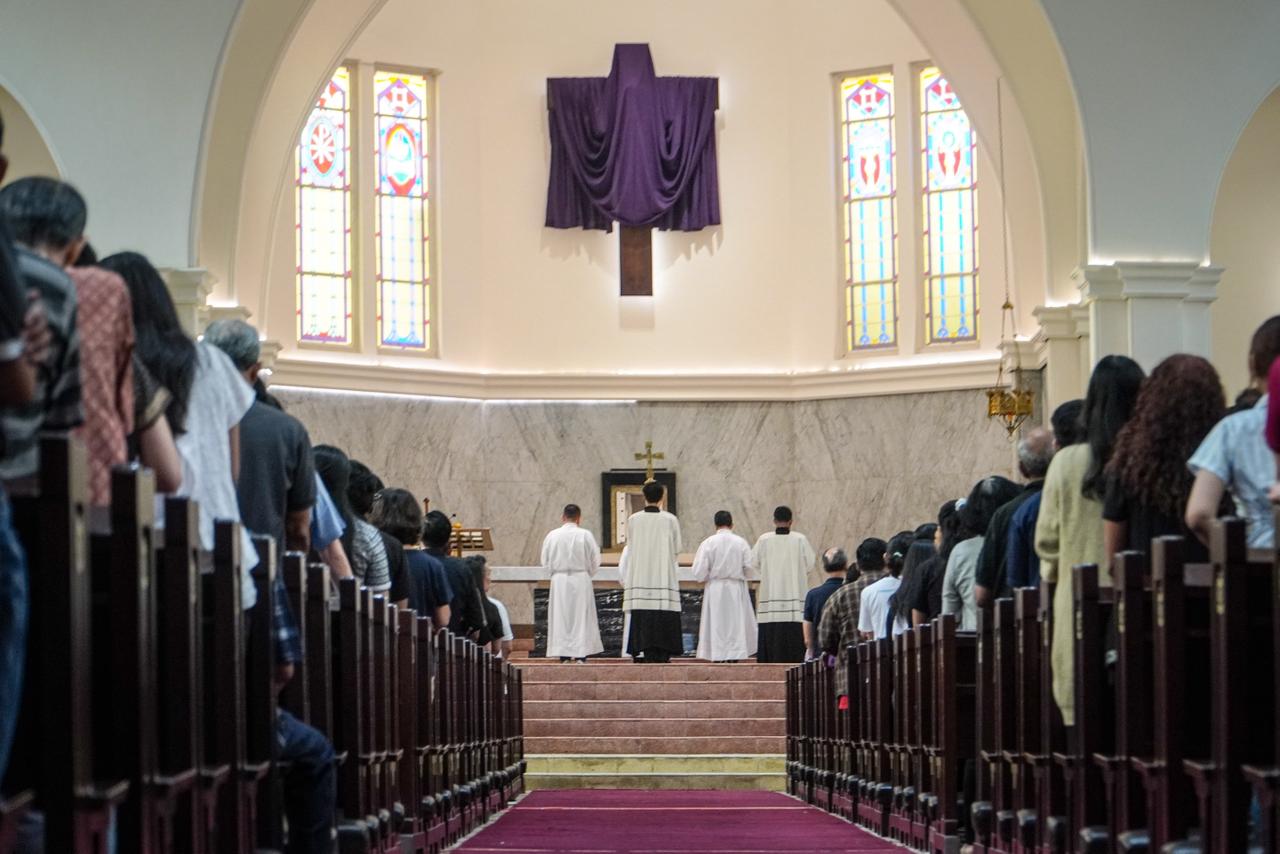Ribuan umat Katolik menghadiri misa Kamis Putih di Gereja Santo Yakobus Citraland, Surabaya yang digelar dalam dua sesi untuk mengakomodasi tingginya partisipasi jemaat.