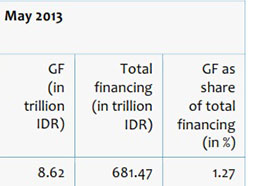 Data dari United Nations Environment Programme (UNEP), yang merupakan program lingkungan dari Perserikatan Bangsa-Bangsa (PBB), mencatat jika share green financing terhadap total pembiayaan dari 24 bank konvensional di Indonesia ternyata hanya mencapai 1,27 persen hingga bulan Mei tahun 2013.