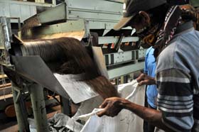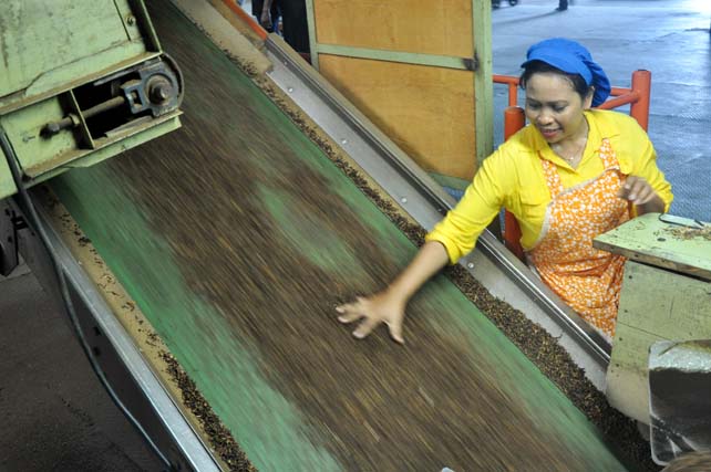 Siti Marwiyah, sibuk memungut kotoran yang keluar dari tungku berjalan pembersih tembakau. Mengambil kerikil, kertas maupun kotoran lain yang tercampur di tembakau rajangan adalah tugas wanita 41 tahun ini. Lima tahun bekerja di perusahaan milik Koperasi Karyawan Redrying Bojonegoro (Kareb), Siti baru enam bulan menempati tugas baru sebagai pemungut kotoran tembakau.