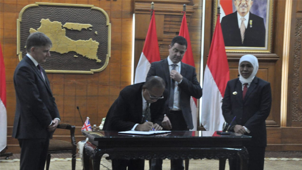 Khofifah Indar Parawansa Gubernur Jawa Timur dan Owen John Jenkins Duta Besar Inggris untuk Indonesia menyaksikan penandatanganan MoU (Memorandum of Understanding/Nota Kesepahaman) itu.