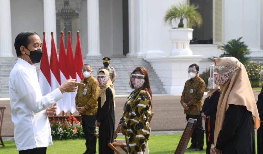 Dengan menerapkan protokol kesehatan, Presiden membagikan bantuan langsung kepada perwakilan masyarakat pelaku usaha mikro yang terkena imbas pandemi Covid-19.