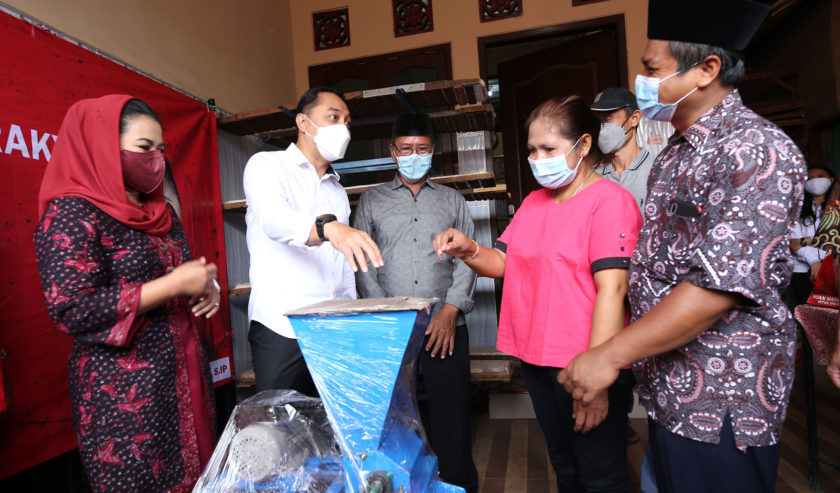 Eri Cahyadi bersama Puti Soekarno memberikan bantuan untuk pengrajin tempe Sukomanunggal, Jumat (11/3/2022). Foto : Diskominfo Kota Surabaya