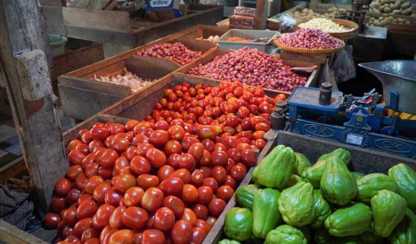 Stock komoditas pangan tomat, bawang merah, dan labu siam di Stock cabai merah keriting, cabai rawit, cabai merah besar di Pasar Jagir, Kec. Wonokromo, Surabaya, Kamis (9/10/2025). Foto: M. Irfan Azhari Mg suarasurabaya.net