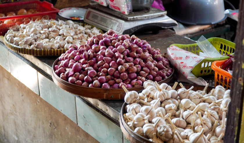 Stock komoditas bawang merah dan bawang putih di Pasar Soponyono Jl. Rungkut Asri Utara, Kec. Rungkut, Surabaya, Rabu (8/10/2025). Foto: M. Irfan Azhari Mg suarasurabaya.net