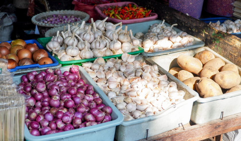 Komoditas bawang merah, bawang putih, kentangg, bawang bombay, cabai rawit yang dijual salah satu pedagang di Pasar Soponyono Jl. Rungkut Asri Utara, Kec. Rungkut, Surabaya, Rabu (8/10/2025). Foto: M. Irfan Azhari Mg suarasurabaya.net