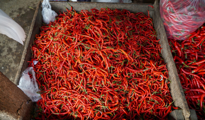 Stock cabai meah keriting di Stock cabai merah keriting, cabai rawit, cabai merah besar di Pasar Jagir, Kec. Wonokromo, Surabaya, Kamis (9/10/2025). Foto: M. Irfan Azhari Mg suarasurabaya.net