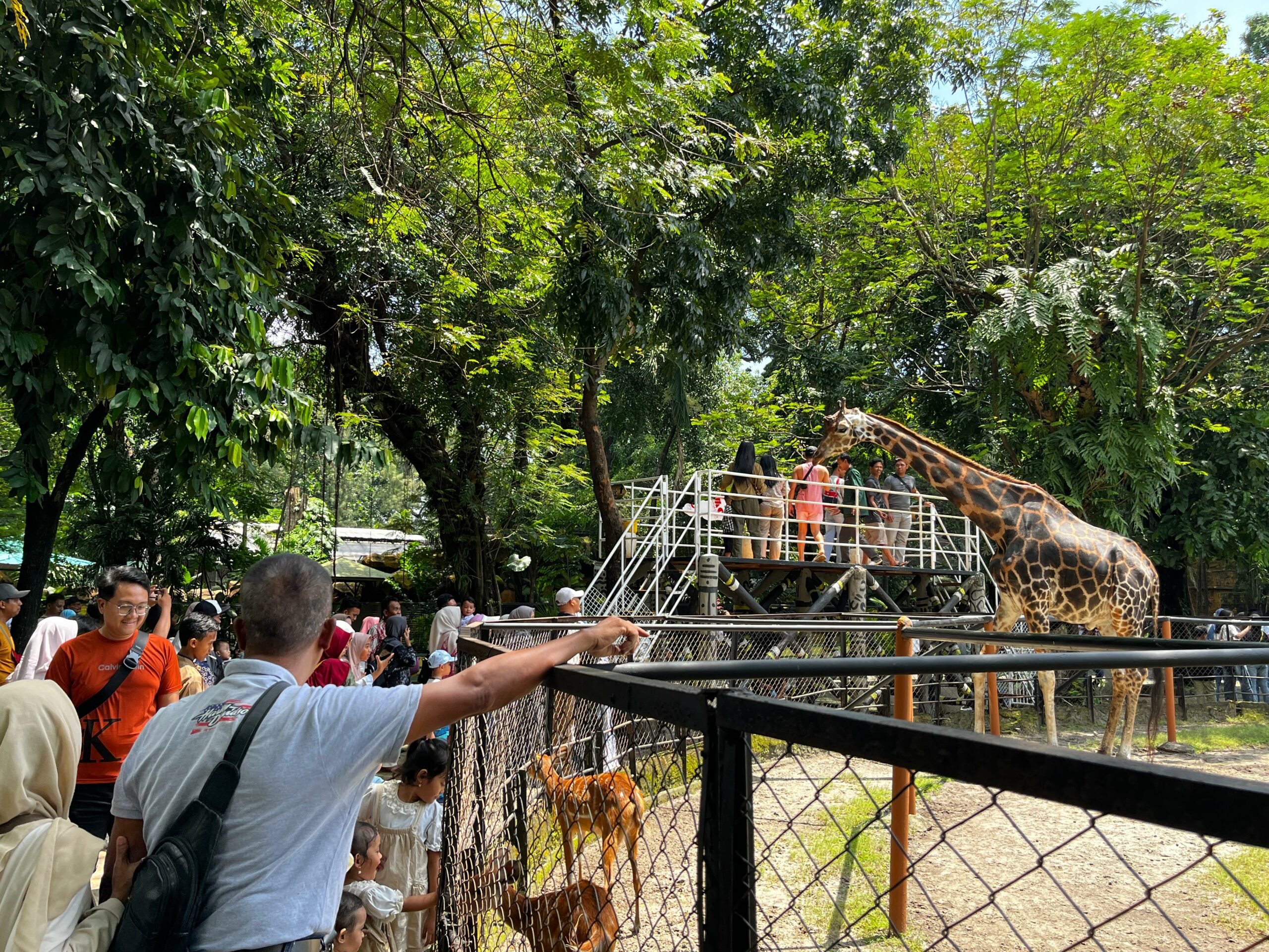 Potret keseruan pengunjung di wahana feeding jerapah Kebun Binatang Surabaya, Senin (23/3/2026). Foto: Meilita Elaine suarasurabaya.net