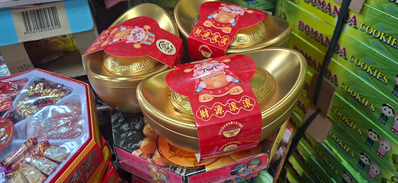 Cokelat dan manisan khas Imlek yang dijual di Pasar Atom, Surabaya pada Selasa (3/2/2026). Foto Lea Citra Santi Baneza suarasurabaya.net