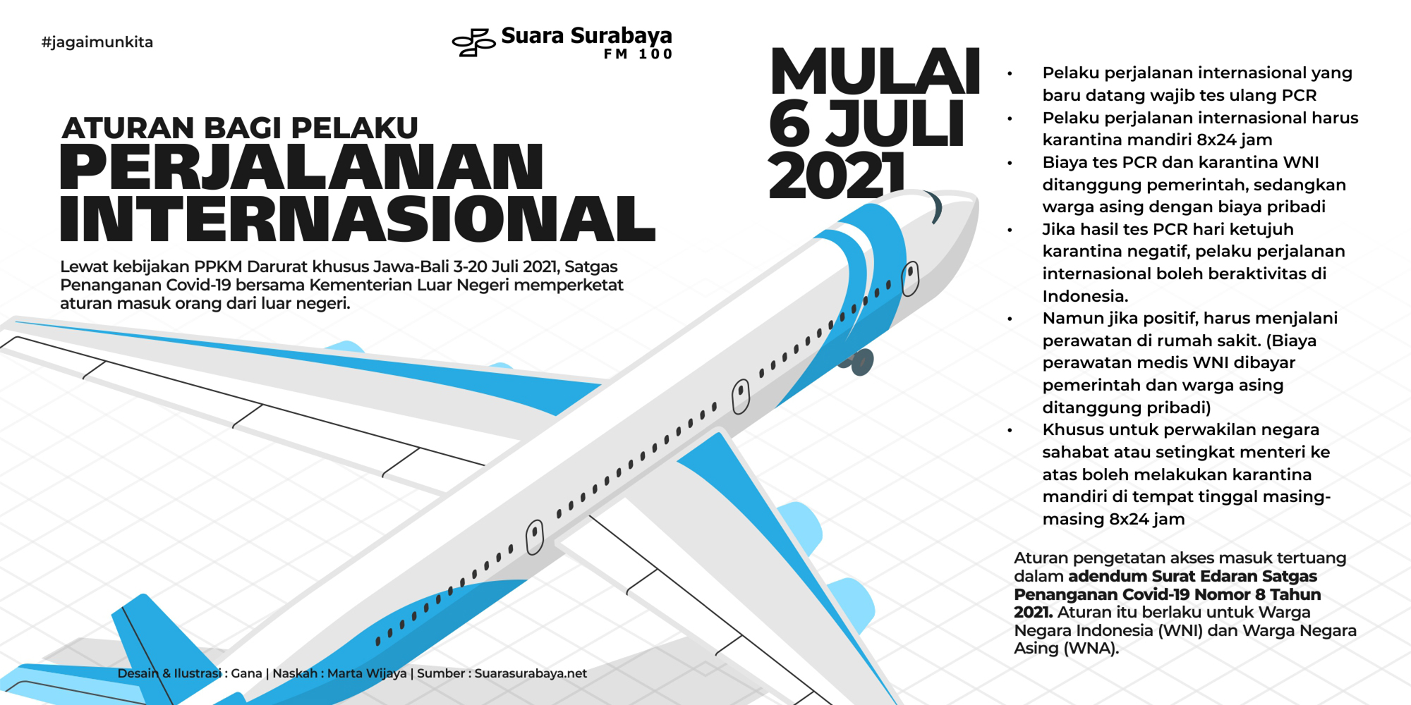 Pemerintah memperketat pembatasan aktivitas sosial ekonomi masyarakat lewat kebijakan Pemberlakuan Pembatasan Kegiatan Masyarakat (PPKM) Darurat Khusus Jawa-Bali mulai 3-20 Juli 2021. Untuk menekan kasus Covid-19 di berbagai wilayah yang melonjak signifikan sebulan belakangan, Satgas Covid-19 bersama Kementerian Luar Negeri memperketat aturan masuk orang dari luar negeri. Apa saja aturannya? Simak dalam postingan berikut atau baca melalui suarasurabaya.net