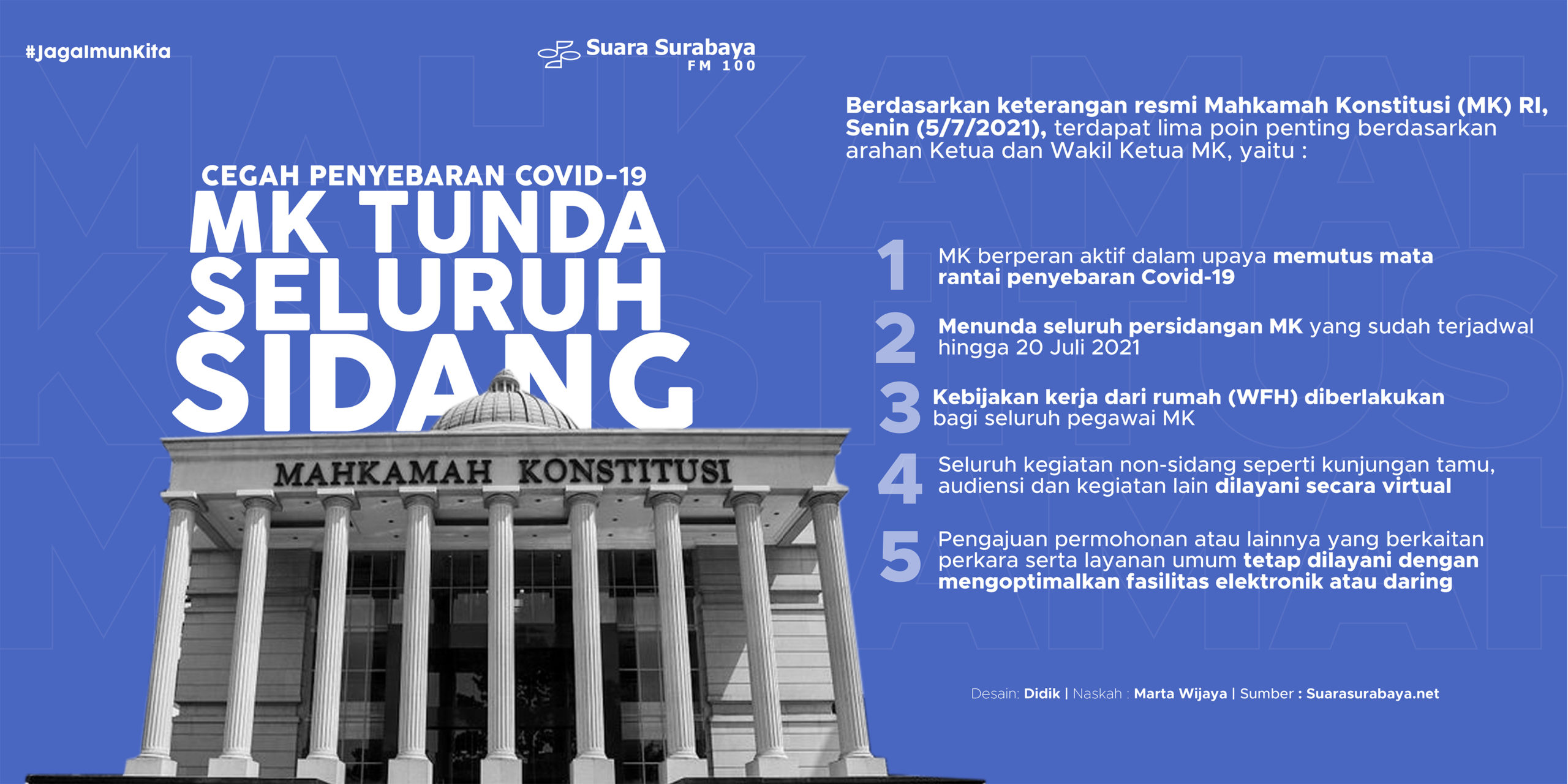 Mahkamah Konstitusi (MK) RI menunda seluruh sidang yang telah terjadwal hingga 20 Juli 2021, akhir penerapan PPKM Darurat periode pertama, demi menghindari penyebaran Covid-19 di lingkungan lembaga peradilan itu. Tetap melayani pengajuan permohonan, simak ketentuannya dalam infografis berikut.