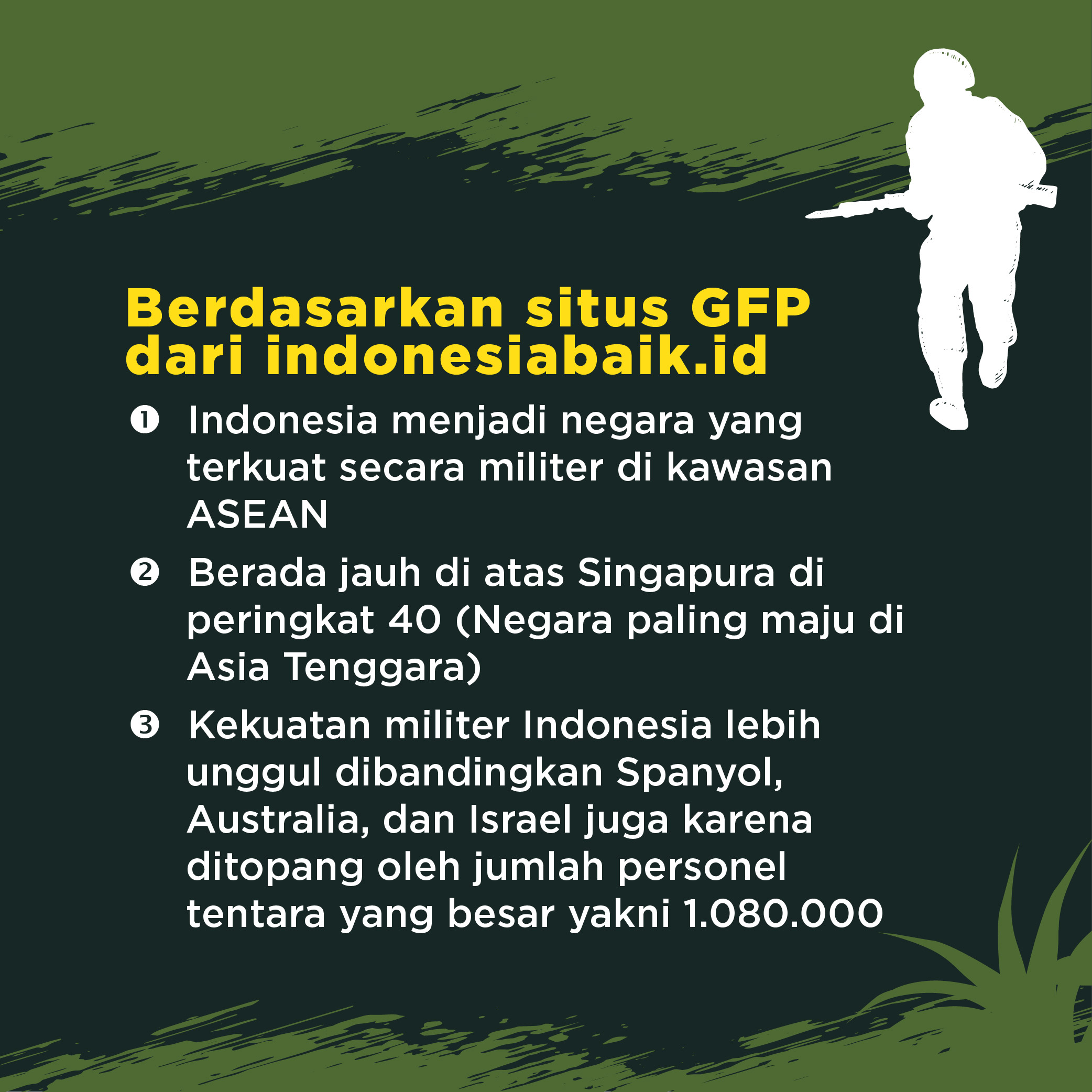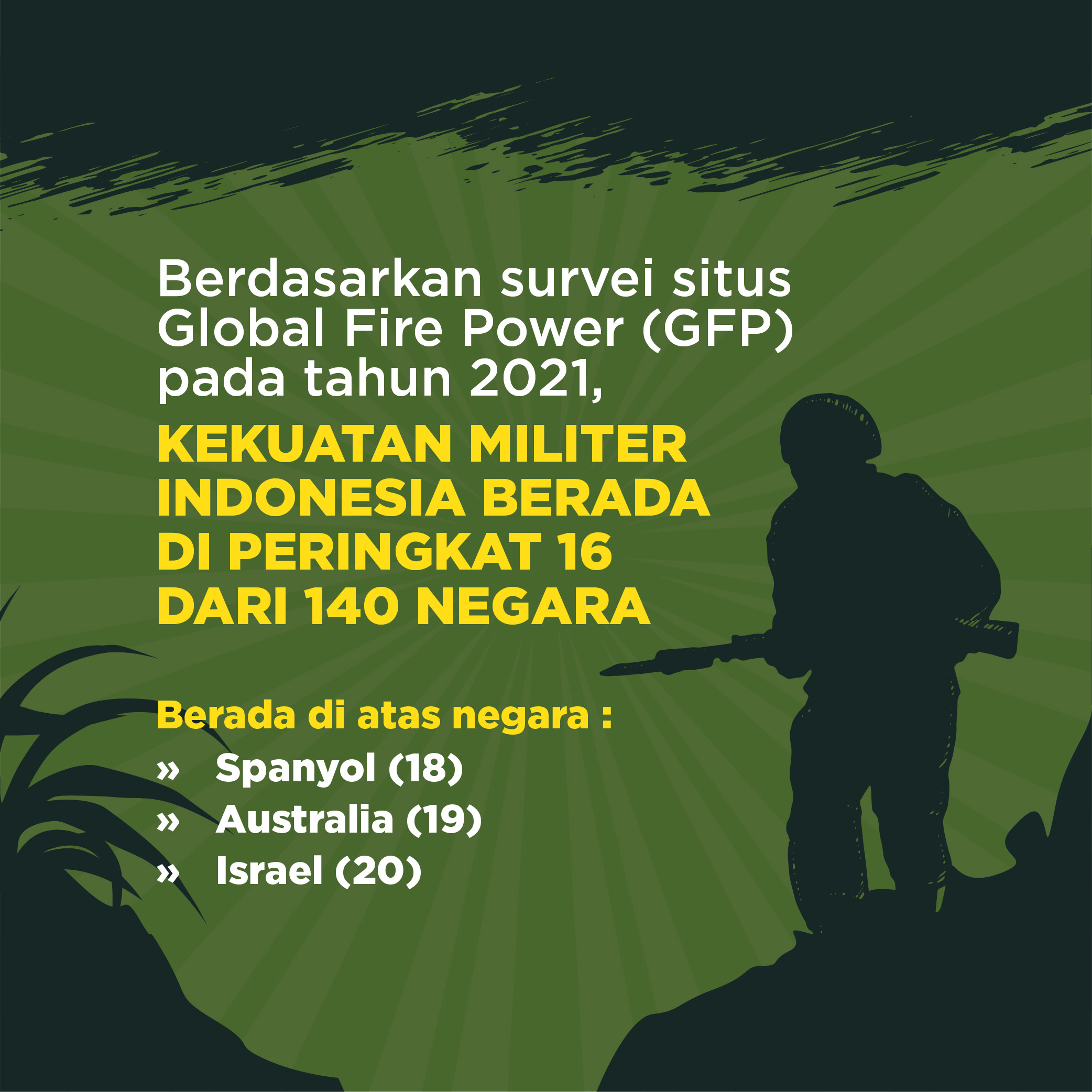 Kekuatan militer Indonesia berada di peringkat 16 dari 140 negara yang disurvei situs Global Fire Power (GFP) pada tahun 2021. Dengan kekuatan lebih dari satu juta personel militer, Indonesia bahkan menjadi negara yang terkuat secara militer di kawasan ASEAN