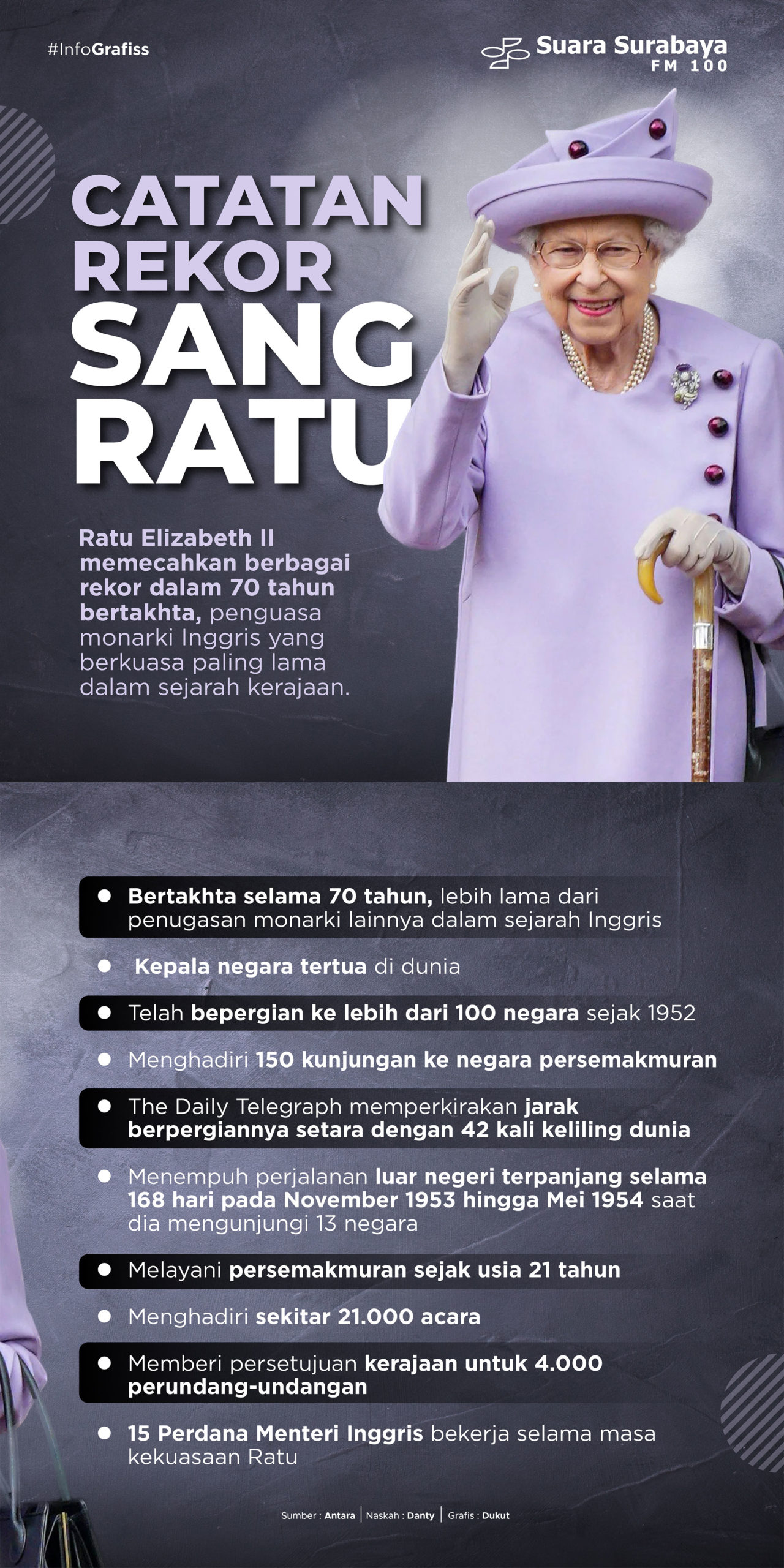 Ratu Elizabeth II meninggal dunia di Balmoral pada Kamis malam di usia 96 tahun. Berbagai rekor dipecahkan Ratu Elizabeth selama 70 tahun bertakhta menjadi penguasa monarki Inggris.