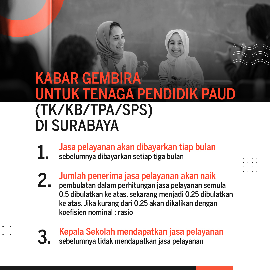 Kebijakan ini disampaikan Rini Indriyani Bunda PAUD Kota Surabaya saat melakukan sosialisasi formulasi pemberian biaya Jaspel bagi tenaga pendidik PAUD di Kota Pahlawan, Senin (4/4/2022). Sosialisasi ini juga diikuti Yusuf Masruh Kepala Dinas Pendidikan (Dispendik) beserta Tim Ahli PAUD Martadi dan Thussy Apriliyandari Ketua Pokja Bunda PAUD Kota Surabaya.