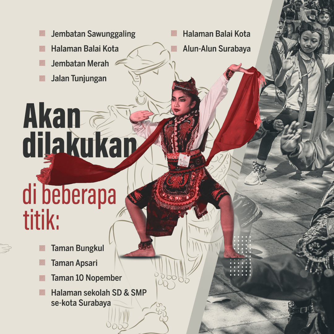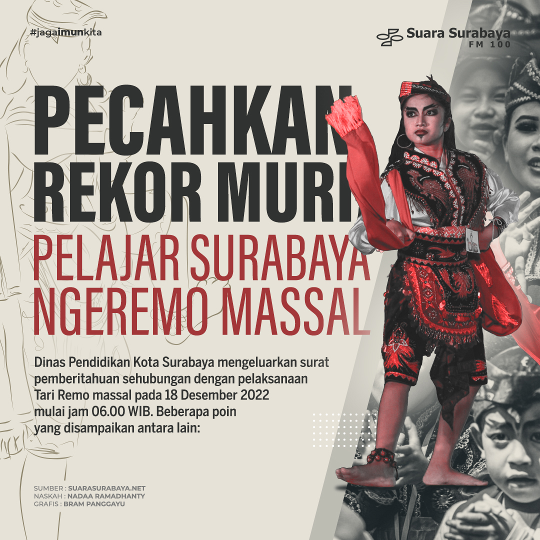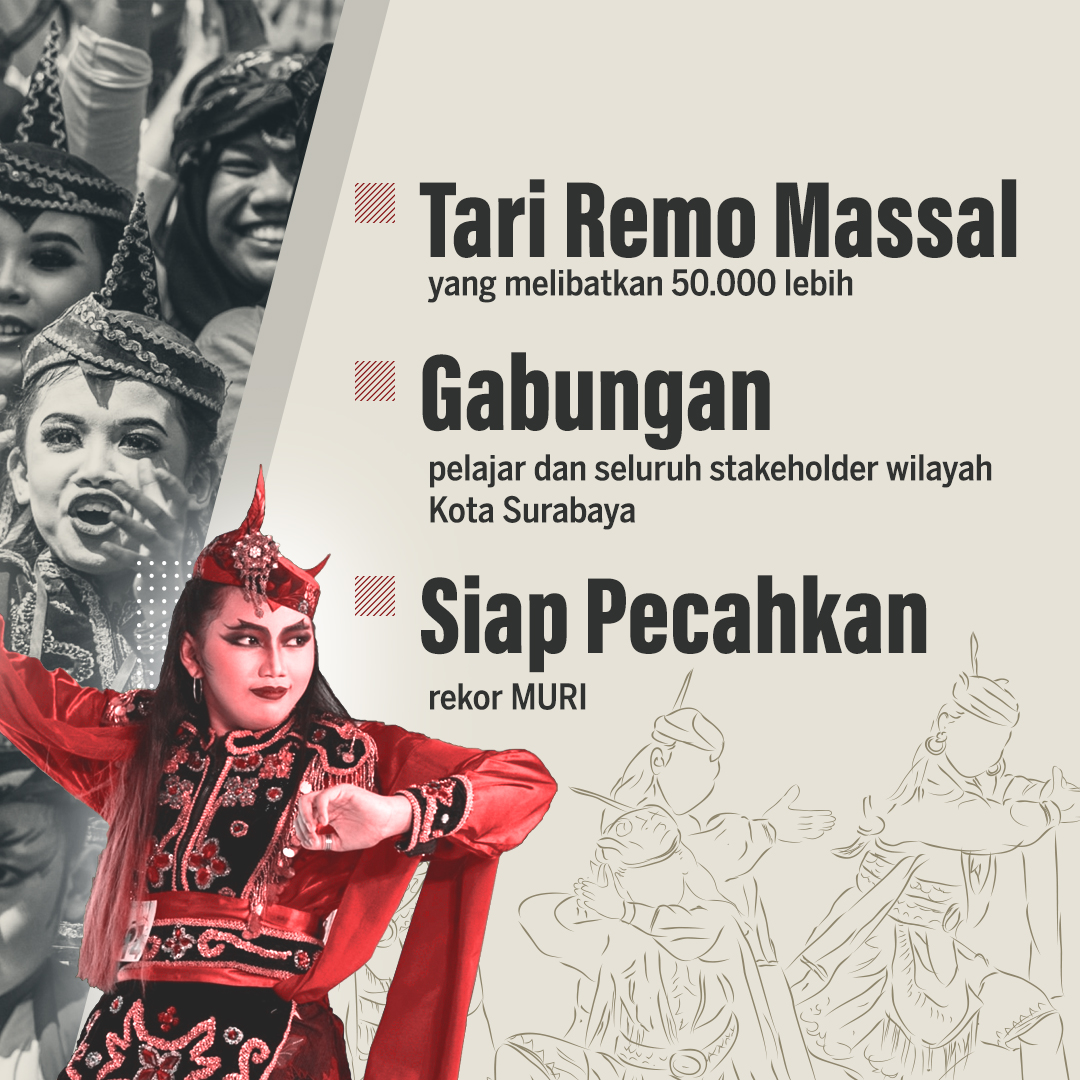 Sekitar 50.000 lebih gabungan pelajar dan seluruh stakeholder wilayah Kota Surabaya, akan berkolaborasi dalam menampilkan Tari Remo di beberapa titik Surabaya. Pemerintah Kota (Pemkot) Surabaya memastikan gelaran ini tidak memberatkan pelajar maupun wali murid.