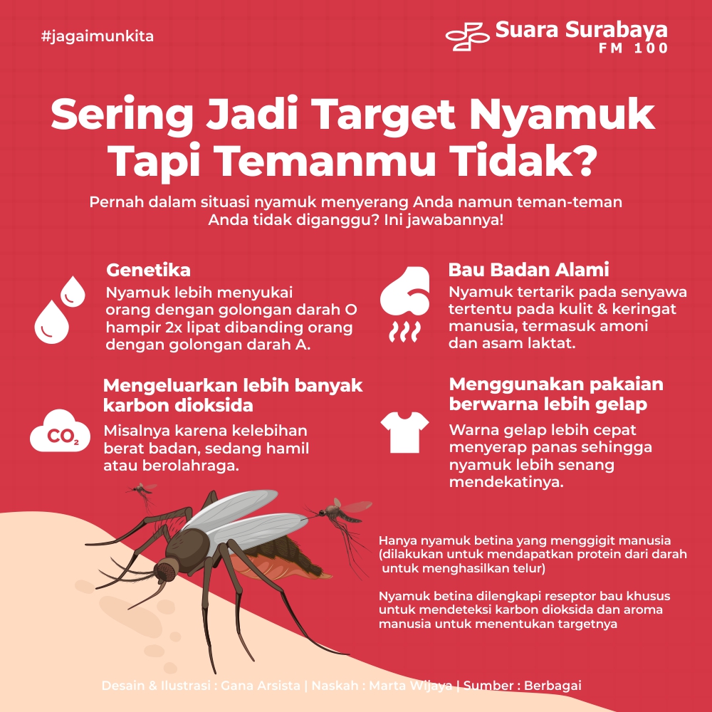 Pernah dalam situasi Anda diserang nyamuk tapi teman Anda tidak? Ada berbagai faktor yang menyebabkan hal ini terjadi, simak informasi dalam infografis berikut.