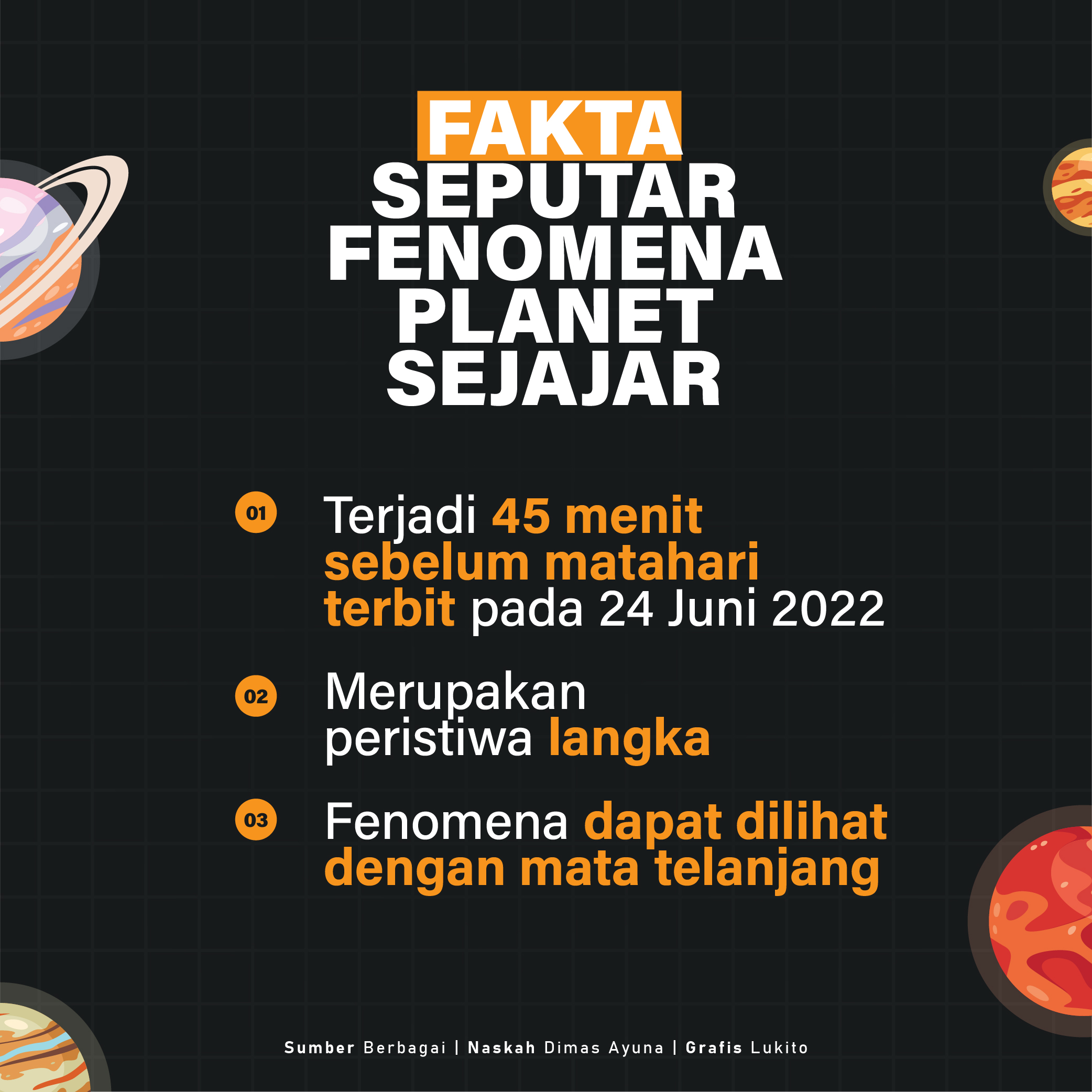 Fenomena planet sejajar bersama dengan bulan yang langka akan terlihat dari bumi pada 24 Juni 2022 mendatang. Terhitung ada enam objek benda langit, yakni 5 planet dan 1 bulan yang berada pada posisi sejajar dalam fenomena ini.
