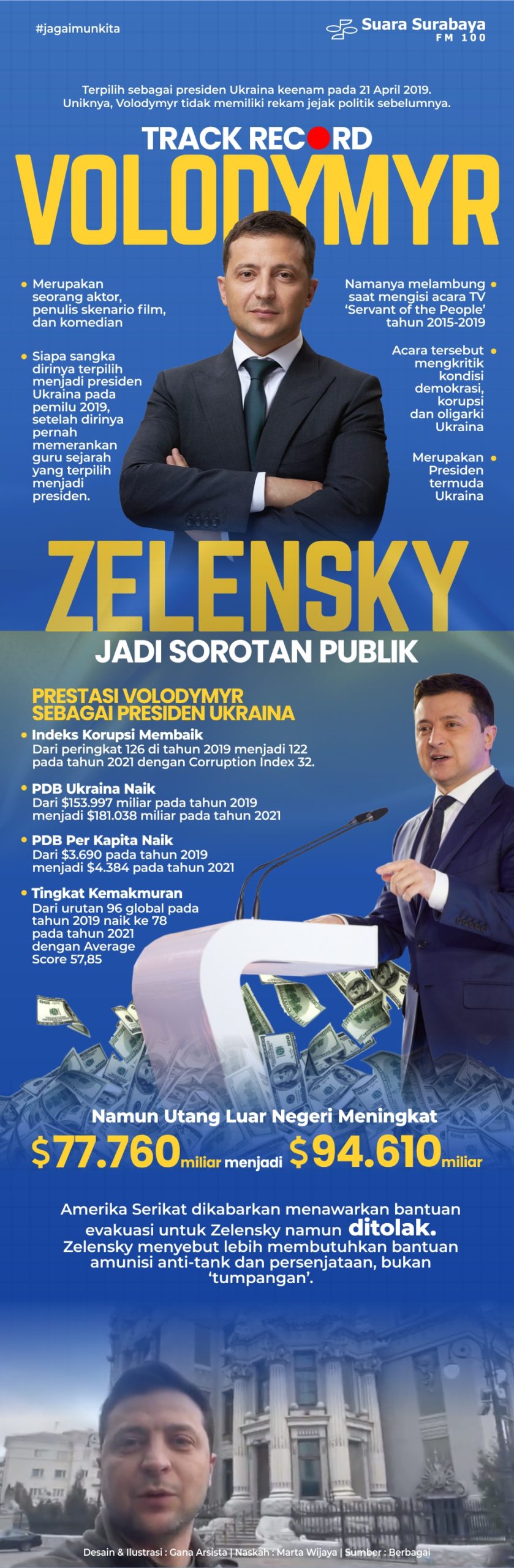 Rusia-Ukraina memanas, Volodymyr Zelensky Presiden Ukraina menjadi sorotan publik. Hal ini karena diketahui dia tidak memiliki background politik sebelumnya. Bagai mimpi yang menjadi nyata, Zelensky yang sebelumnya berprofesi sebagai aktor, penulis skenario film, dan komedian sempat berperan menjadi guru sejarah yang terpilih menjadi presiden. Uniknya, dirinya betulan terpilih menjadi presiden dengan memenangkan pemilu Ukraina tahun 2019. Lalu dengan background seperti itu, bagaimana kinerjanya? Simak selengkapnya dalam infografis berikut.