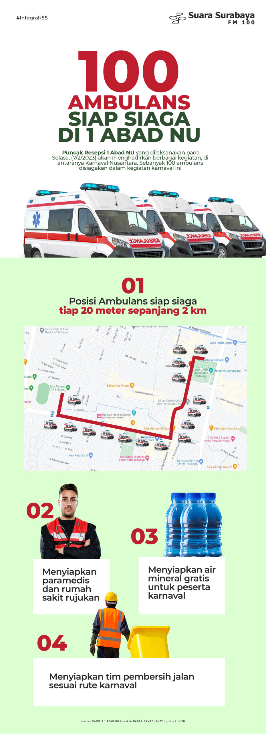 Puncak Resepsi 1 Abad NU yang dilaksanakan pada Selasa, (7/2/2023) akan menghadirkan berbagai kegiatan, di antaranya Karnaval Nusantara. Sebanyak 100 ambulans disiagakan dalam kegiatan karnaval ini.