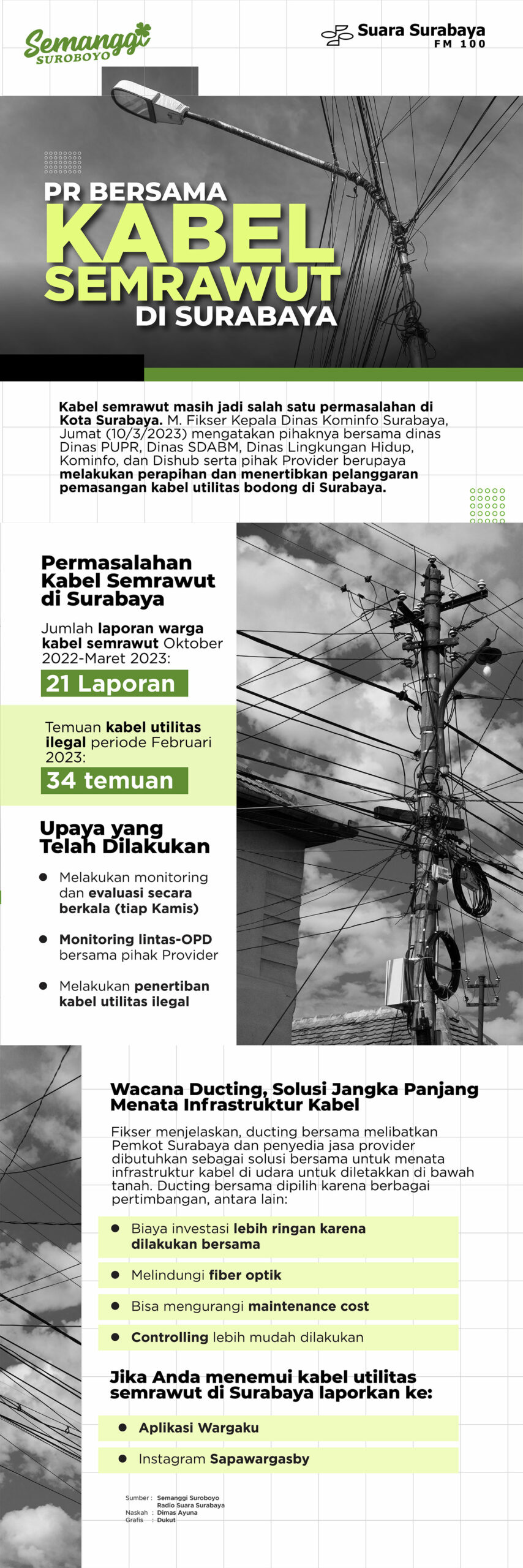 Kabel semrawut masih jadi salah satu permasalahan di Kota Surabaya. M. Fikser Kepala Dinas Kominfo Surabaya, Jumat (10/3/2023) mengatakan pihaknya bersama dinas Dinas PUPR, Dinas SDABM, Dinas Lingkungan Hidup, Kominfo, dan Dishub serta pihak Provider berupaya melakukan perapihan dan menertibkan pelanggaran pemasangan kabel utilitas bodong di Surabaya