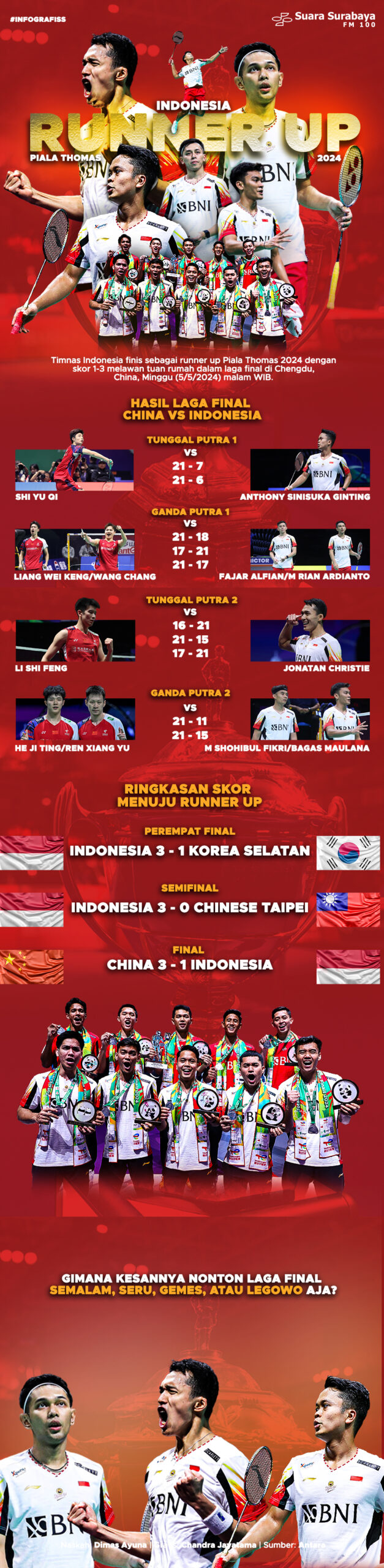 Timnas Indonesia finis sebagai runner up Piala Thomas 2024 dengan skor 1-3 melawan tuan rumah dalam laga final di Chengdu, China, Minggu (5/5/2024) malam WIB.