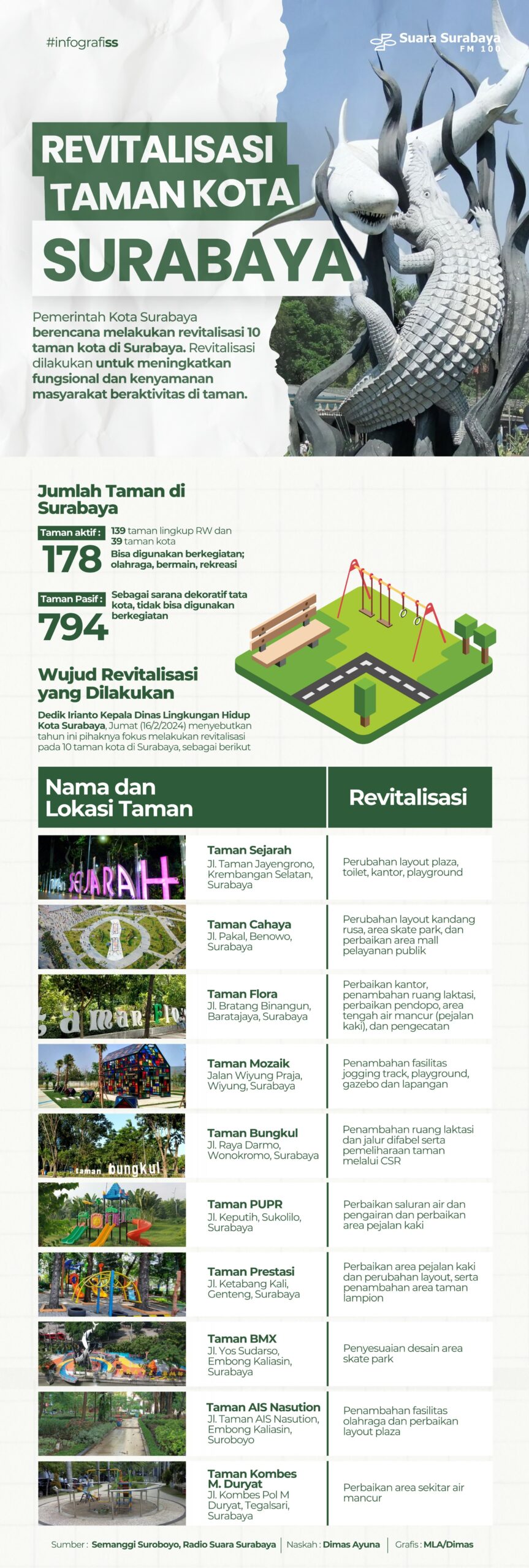 Pemerintah Kota (Pemkot) Surabaya melalui Dinas Lingkungan Hidup (DLH) menarget bakal merevitalisasi 10 taman yang ada di Kota Pahlawan di tahun 2024 ini.