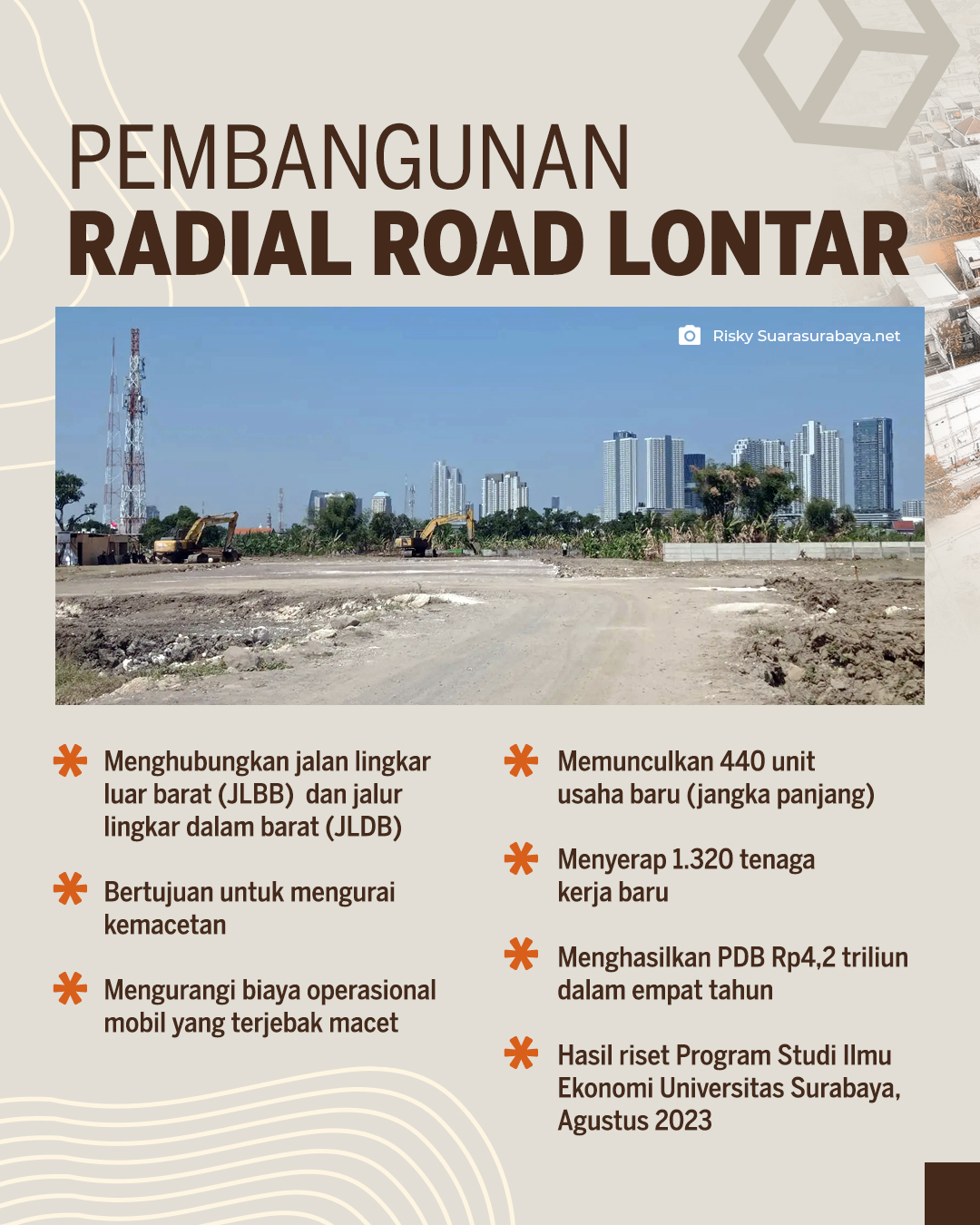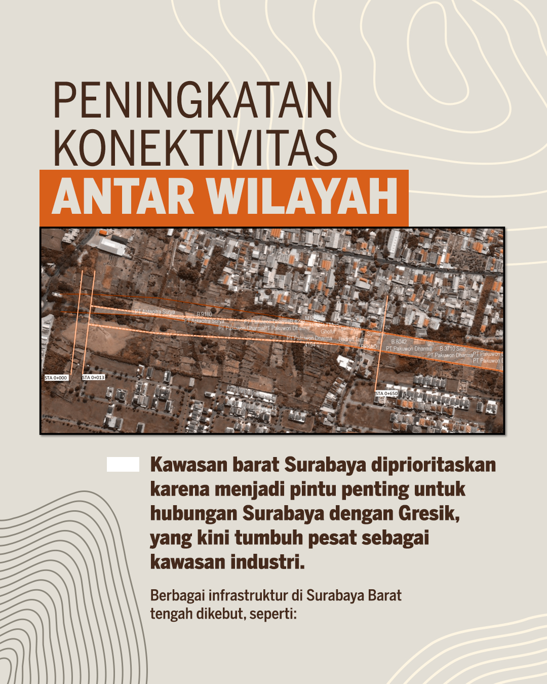 Pemkot Surabaya terus berupaya membangun kota. Sepanjang 2025 sampai 2029 pemerintah menyiapkan dan menjalankan sejumlah program pembangunan untuk mewujudkan wajah baru Surabaya yang nyaman dan produktif di berbagai sektor mulai dari peningkatan konektivitas antarwilayah, pelebaran jalan, penerangan jalan umum, sampai penanganan genangan