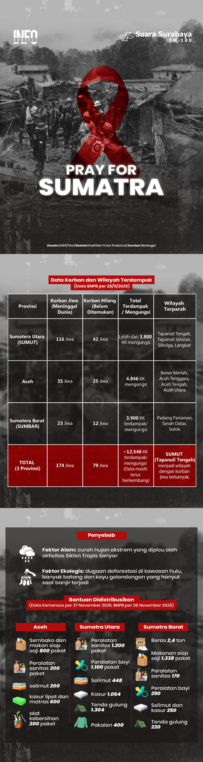 Banjir bandang dan longsor melanda Sumatra Utara, Sumatra Barat, dan Aceh. Data 28 November 2025, bencana di Aceh, Sumut, Sumbar menelan 174 meninggal dunia dan 79 hilang. Ribuan rumah terendam, akses jalan terputus.