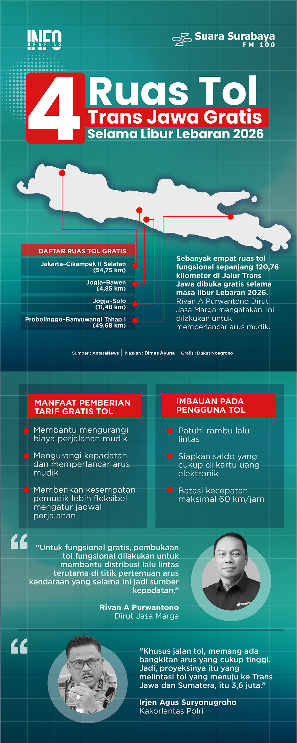 Sebanyak empat ruas tol fungsional sepanjang 120,76 kilometer di Jalur Trans Jawa dibuka gratis selama masa libur Lebaran 2026
