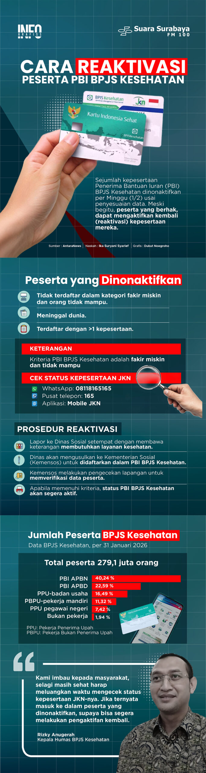BPJS Kesehatan menyatakan bahwa penonaktifan sejumlah peserta BPJS Kesehatan segmen Penerima Bantuan Iuran bukan berarti hak layanan kesehatan peserta tersebut hilang.
