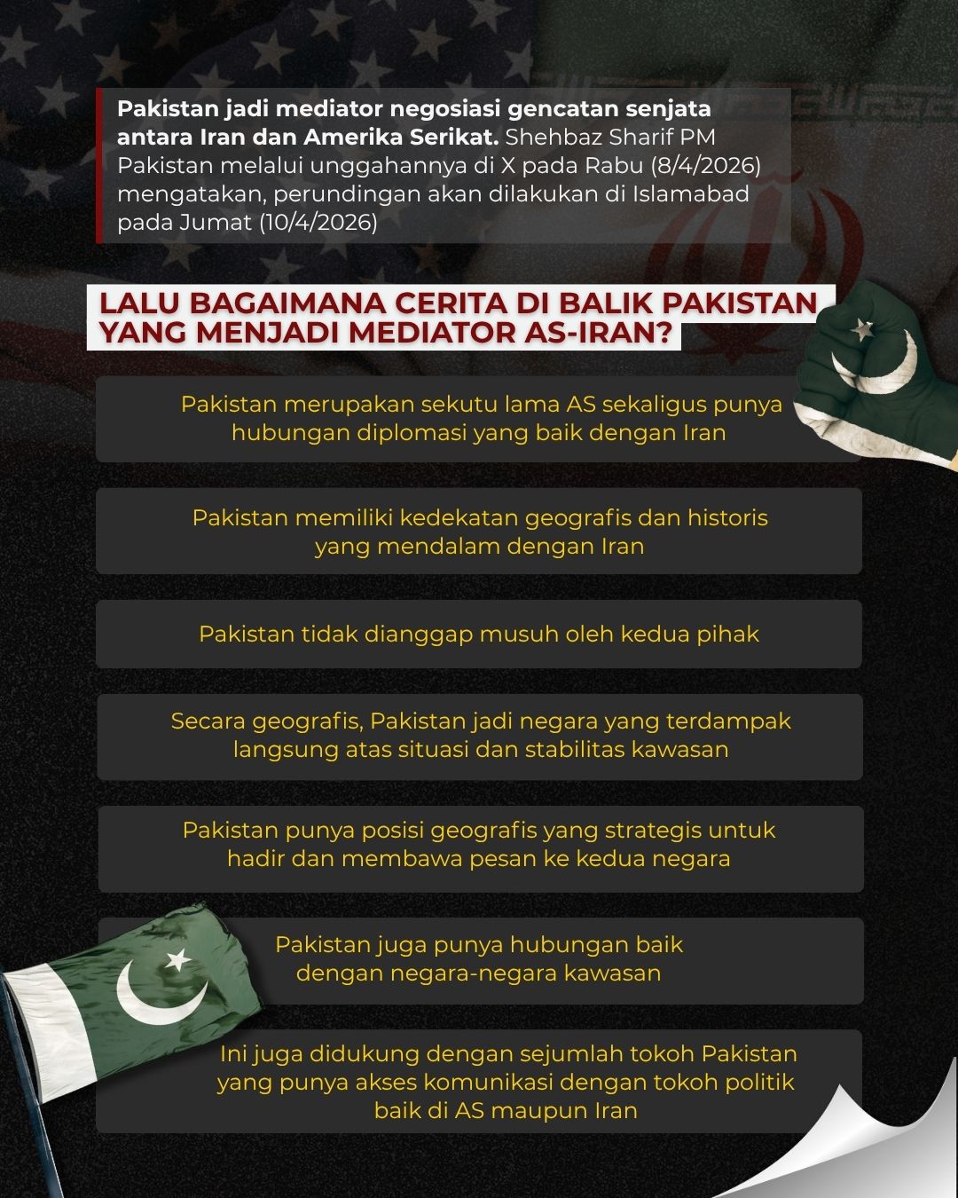 Pakistan jadi mediator negosiasi gencatan senjata antara Iran dan Amerika Serikat. Shehbaz Sharif PM Pakistan melalui unggahannya di X pada Rabu (8/4/2026) mengatakan, perundingan akan dilakukan di Islamabad pada Jumat (10/4/2026).