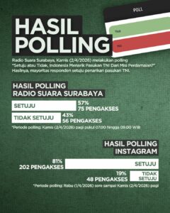 Radio Suara Surabaya, Kamis (2/4/2026) melakukan polling “Setuju atau Tidak, Indonesia Menarik Pasukan TNI Dari Misi Perdamaian”, hasil polling Radio Suara Surabaya menunjukkan mayoritas pendengar setuju penarikan pasukan TNI dari misi perdamaian. Kalau Anda setujukah dengan usulan tersebut?