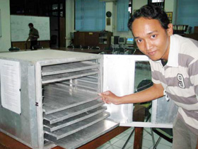Apa bedanya dengan open manual? “Sangat beda, kalau open manual kita tidak bisa mengontrol suhu didalamnya, sedang pada alat pengering ini suhunya bisa dikontrol dan disesuaikan dengan kebutuhan suhu yang memang diiginkan untuk mengeringkan bahan-bahan yang ada, dan secara otomatis pula pemanas akan mati jika suhunya terlalu tinggi,” kata PRIANTO yang berhasil memperoleh nilai AB dari rancangan alatnya itu pada skripsi yang telah dipertahankannya.(ipg/ipg)