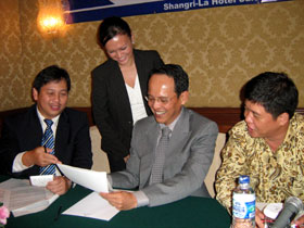 – Pembukaan kantor cabang Metrodata di Surabaya dihadiri pimpinan prinsipal software dan jaringan seperti ADI J RUSLI Managing Director Oracle Indonesia (kanan), KUSNADI (tengah), JESSICA Marketing Manager SAP Indonesia dan WIBISONO (kiri) dari Sun Microsystem