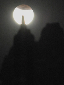 – Gerhana bulan pada Selasa (28/08) malam yang dipotret pukul 19.10 WIB dari Candi Borobudur, Jateng.