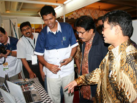 -SOFYAN DJALIL Menteri Komunikasi dan Informasi (kedua dari kanan) meninjau stan XL di APRICOT 2007 di Bali