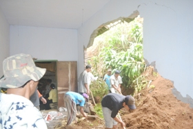 Akibatnya, tembok sisi kiri rumah jebol. Namun longsoran tanah tidak sampai merobohkan rumah yang diketahui milik Nuratim ini.
