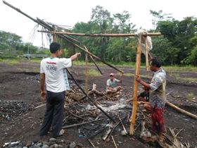 – Aparat satpol PP Kabupaten Lumajang membakar gubung tempat istirahat penambang pasir tradisional.