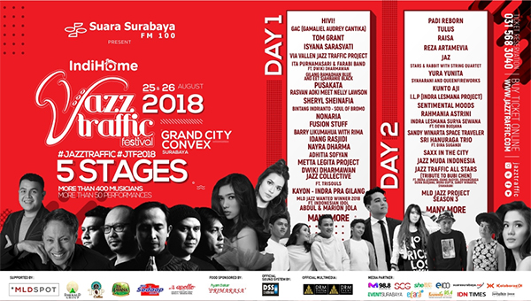 Indihome Jazz Traffic Festival (JTF) 2018 akan digelar di Grand City Convex Surabaya pada Sabtu-Minggu, 25-26 Agustus 2018.