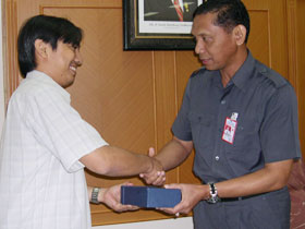 3. YOYONG BURHANUDIN (kiri) saat menerima cendera mata dari BUDIHARTO.