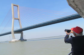 Perjalanan semakin seru saat kapal yang memiliki kapasitas 35 orang ini melintas di bawah jembatan Suramadu. Kru Suara Surabaya Media yang selama ini sering melintas di atasnya, dibuat takjub dengan view sederhana namun mengesankan tersebut. Sejurus kemudian, semua handphone dan kamera yang dibawa langsung nyala dan siap mengabadikan momen-momen itu.