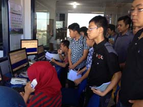 Para siswa nampak antusias saat melihat langsung ruang produksi Radio Suara Surabaya. Ini terbukti banyak siswa yang melontarkan pertanyaan terkait dunia radio. (dwi/ipg)