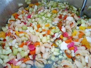Ada yang membakar sate sosis, bakso dan potongan nanas. Ikan laut dengan ukuran jumbo yang sudah dibalut dengan bumbu-bumbu juga siap untuk dibakar. Tak tanggung-tanggung 15 kilogram sosis dan 40 kilogram ikan laut dalam beberapa saat kemudian sudah siap di meja makan.