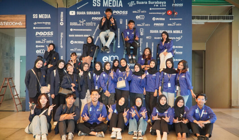 Puluhan fungsionaris dan magang dari BEM Ilmu Sosial dan Ilmu Politik (FISIPOL) dari Universitas Negeri Surabaya (Unesa) mengunjungi Suara Surabaya, pada Jumat (3/10/2025).