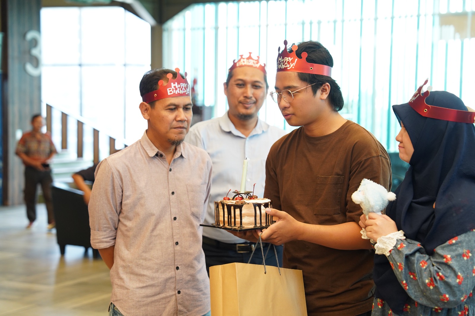 Sementara itu kru yang dirayakan ulang tahunnya adalah Taufik dan Sugeng dari Tim Teknik, kemudian Chandra Tim Grafis New Media, serta Keuamala Andini Penyiar SS.