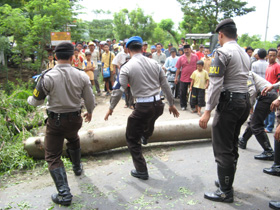 2. Polisi sempat berupaya meminggirkan batang pohon namun percuma. Tak lama kemudian, batang pohon tersebut ditengahkan lagi oleh ratusan warga.