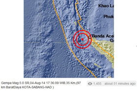 Lokasi gempa tersebut berada di 97 kilometer barat daya Kota Sabang provinsi berpenduduk sekitar 5 juta jiwa itu, dengan kedalaman 35 kilometer.